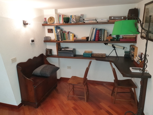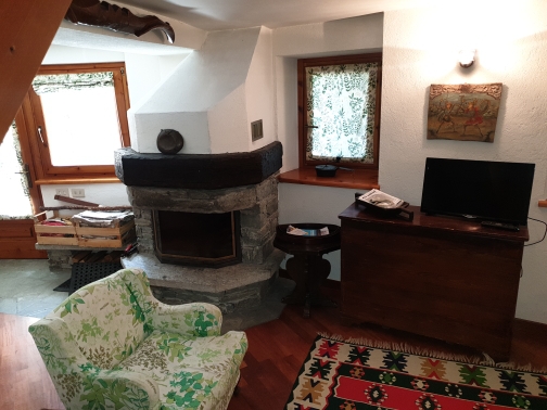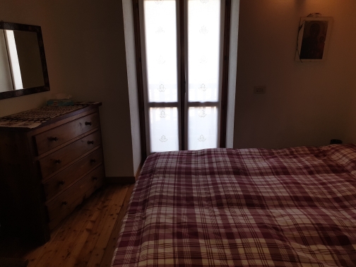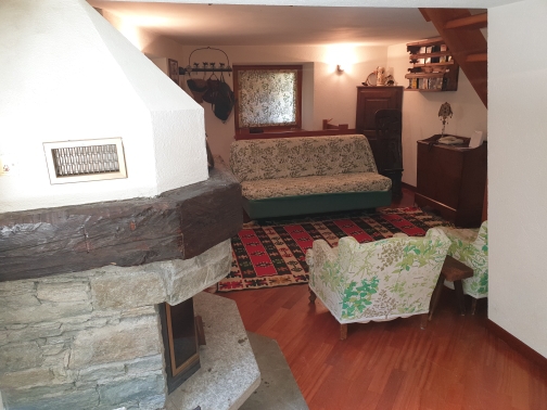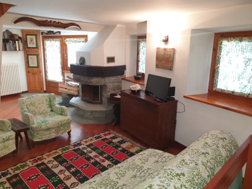 Ampio soggiorno con camino, cucina abitabile, 2 camere da letto, doppi servizi, ripostiglio e balcone con vista sulle montagne e sul lago di Maen.